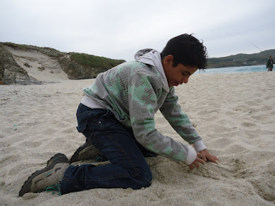 Cuando los responsables de la asociación Solidariedade Galega co Pobo Saharaui me vieron, creyeron que necesitaba silla de ruedas. Pero con el paso de los días, me iba desplazando mejor. En mi nueva familia, también había otro saharaui, Ahmed, de 16 años. Me ayudaba a comunicarme y me servía de referente. Pasamos el verano en la playa, jugando a la pelota y trabajando para tener más destreza motriz. Fui continuamente al médico, uno para que me viera los ojos, otro para que me sacase sangre, otro que me mandó cosas muy raras: lanzar una pelota, hacer un círculo en un papel, hacer una torre con cubos.... y mil cosas más, todas complicadísimas.